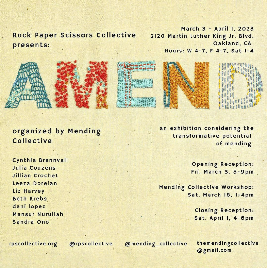 We are pleased to announce our March show: AMEND an exhibition considering the transformative potential of mending. Organized by Mending Collective.